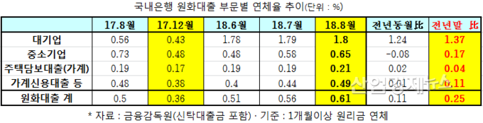 특징은, 기업대출 연체율 증가세가 가팔랐다. 그 중에서도 대기업대출 연체율(1.80%)이 지난 연말 0.43%에 비해 4배(1.37%p↑) 폭등해 전체 연체율을 급등시켰고, 더구나 6월말과 직 전월인 7월보다도 각 각 0.01%p씩 상승추세를 이어가고 있어 리스크 관리에 경종을 울렸다.