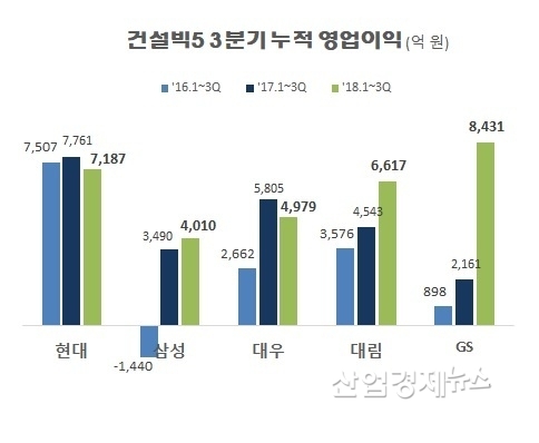 GS건설이 발표한 3분기 잠정실적과 증권가에서 추정한 나머지 회사들의 3분기 실적을 기준으로, 건설빅5의 최근 3년 1~3분기 누적실적을 보면 회사마다 각기 다른 양상을 보인다.