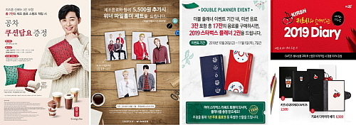 올해도 역시 커피 프랜차이즈 주요 업체들은 작년과는 또 다른 디자인의 다이어리를 사은품으로 준비해 연말 다이어리 전쟁에 불을 지폈다.