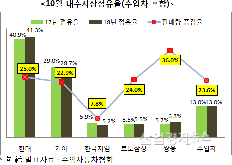 국내완성차 중 올해들어 10월까지 가장 큰 감소폭은 한국지엠 -32.3%, 이어서 르노삼성 -13.5%로 전체 0.8%의 마이너스 성장을 이끌었다.