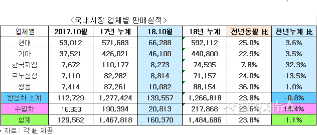 10월 누적판매량에서 수입차는 21만7868대로 14.4% 성장, 국내 완성차 5사(현대·기아자동차, 한국지엠, 르노삼성자동차, 쌍용자동차)의 같은기간 0.8% 감소세와는 대조를 이뤘다.
