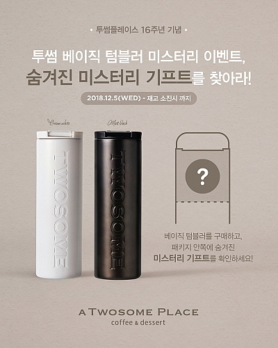 새로 선보인 베이직 텀블러는 매트블랙, 크림화이트 2종으로, 430ml 용량에 투썸 로고가 전면에 새겨진 심플한 디자인이 특징. 특히 텀블러 패키지 안에는 미스터리 기프트 내역이 들어있으며, 선불카드 5천원권, 브라운 머그, 거울 코스터 등 총 7개 경품이 랜덤 증정된다.