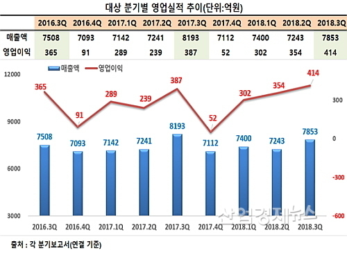 이 회사는 올 3분기 414억 원의 연결 영업이익을 시현, 지난해 3분기의 387억 대비 6.8% 증가해 수익성이 개선됐다. 특히 직전 분기와 비교하면 무려 17.0%나 급증해 지난 2015년 3분기의 436억 원에 이어 2번째로 많은 영업이익을 시현하는 선전을 펼쳤다.