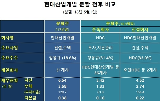 분할과정에서 발행주식수 변동은 없었지만 정 회장이 현물출자를 하면서 지주회사인 HDC의 정 회장 지분은 18.6%에서 31.4%로 늘어 났다.