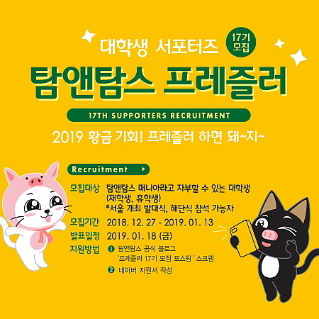 [엔트로피타임즈 민혜정 기자] 커피전문점 탐앤탐스가 1월 13일까지 대학생 서포터즈 ‘프레즐러 17기’를 모집한다.