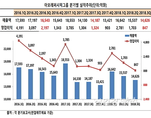 그럼에도 불구하고 경쟁사인 LG생활건강의 경우 매 분기 매출과 손익 모두 사상최고치를 갈아치우며 승승장구하고 있는 것과 견주어보면 문제의 심각성이 크다는 것이 업계의 지적이다.