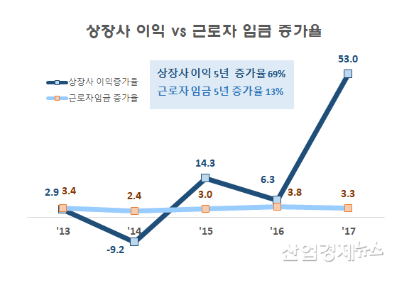 2013년 부터 2017년 5년 동안, 상장회사 영업이익 추이를 보면, 상장회사들은 2014년에는 9.2% 감소했지만 2015년에는 14.3%, 2016년에는 6.3% 그리고 2017년에는 53.0%나 증가했다.