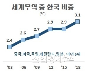 이러한 수출 실적에 힘입어 한국이 세계 무역에서 차지하는 비중도 3.1%를 기록하며 세계 무역시장에서의 점유율을 확대하고 있다.