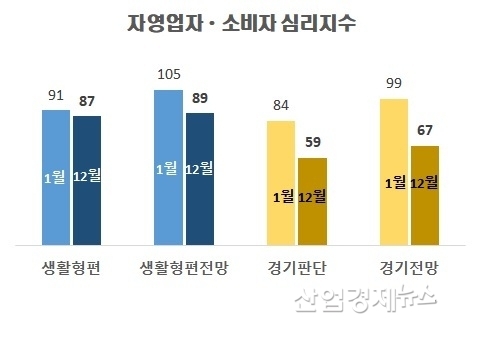 한국은행 경제통계 시스템에 따르면 지난 12월 자영업자와 소비자들의 심리지수는 연초에 비해 모두 크게 위축된 모습을 보이고 있다.