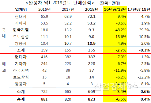 [엔트로피타임즈 김소산 기자] 현대자동차, 기아자동차, 한국지엠, 르노삼성, 쌍용자동차로 대표되는 완성차 5사의 지난해 총 판매량은 823만대로 집계됐다.