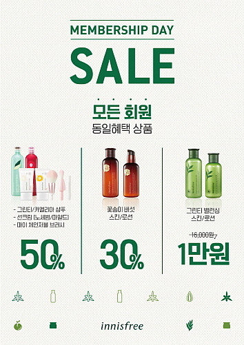 멤버십데이는 이니스프리 회원이라면 누구나 할인 혜택을 받을 수 있는 멤버십 세일로, 세일 제품 구매 시, 그린프라임/그린 등급은 30%, 웰컴 등급은 10%로 등급별 할인이 적용된다.