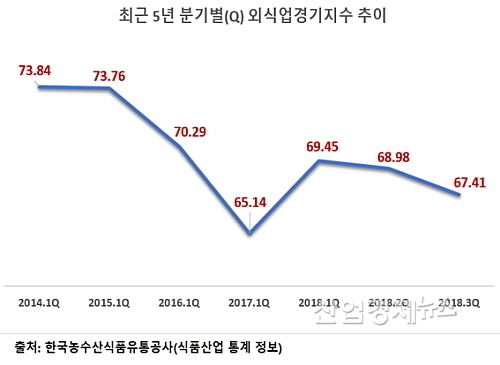 지난해 1분기 69.45로 잠시 반등하는 모습을 보이기도 했지만 2분기엔 68.98, 3분기도 67.41로 재차 하락하는 추세를 보여 외식업계에 위기감이 고조되고 있다.