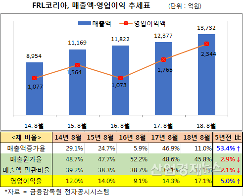 FRL은 8월말 결산법인으로, 지난해 매출액은 1조3732억원, 영업이익은 2344억원을 실현했다. 매출액은 직 전년인 2017년보다 11.% 증가했고 영업이익은 32.8%나 급등했다.