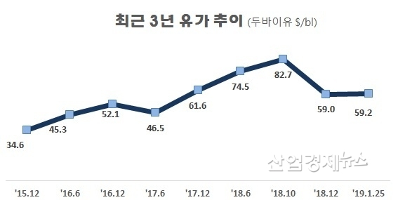 하지만 지난해 말, 미국 정유사의 생산량 증가와 세계경제의 둔화로 재고가 쌓이면서 유가는 60달러 아래로 떨어지며 30% 하락하는 모습을 보였다.