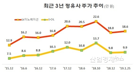 유가가 정점을 찍었던 지난해 10월, SK이노베이션과 S-OIL의 주가도 각각 22만원과 13만원으로 정점을 찍었다. 하지만 유가가 하락하자 정유사의 주가도 하락해 SK이노베이션은 16만6천원, S-OIL은 9만300원까지 떨어졌다.