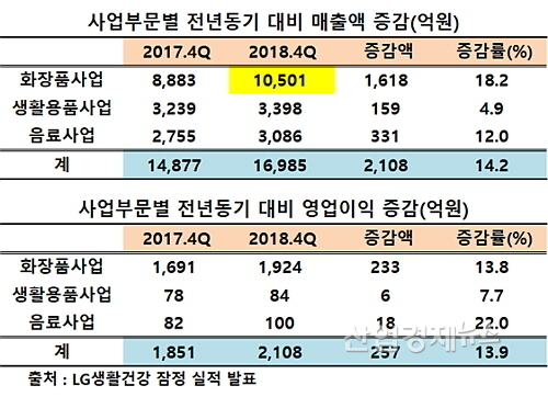 4분기 3대 사업부 외형·손익 고른 성장...화장품 분기매출 첫 1조 돌파