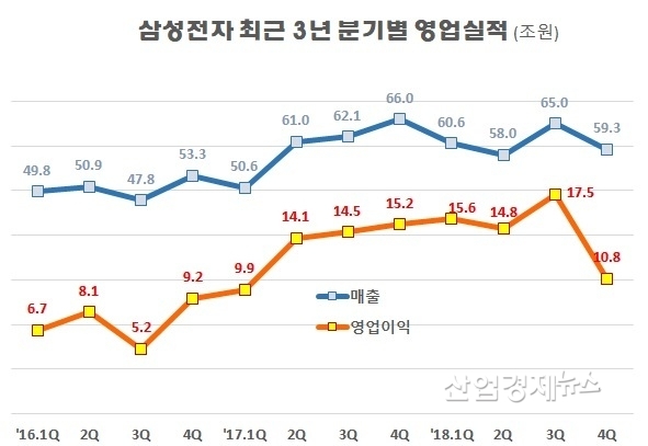 삼성전자의 이번 발표에 따르면 지난 4분기에 매출은 59.3조원, 영업이익은 10.8조원을 기록했다. 매출은 이전 분기보다 9.5% 감소했고, 영업이익은 무려 38.5%나 감소했다.