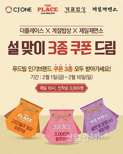 CJONE 앱을 통해 진행하며, 1일부터 10일까지 매일 오전 10시에 선착순 3천명에게 3개 브랜드의 할인 및 서비스 메뉴 쿠폰을 제공한다. 쿠폰 사용 기간은 2월 1일부터 2월 28일까지다.