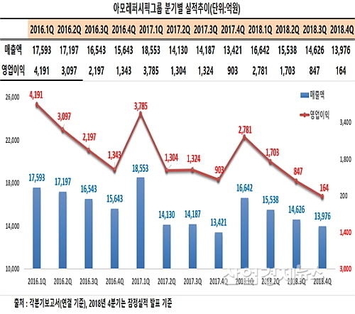 주력기업 아모레퍼시픽과 이니스프리, 에뛰드하우스, 에스쁘아 등 내로라하는 뷰티 계열사들을 거느리고 있는 아모레퍼시픽그룹(아모레G)의 실적이 지난해 4분기에 사상 최악의 손익성적표(어닝 쇼크)를 기록하는 등 좀처럼 부진의 늪에서 벗어날 조짐이 보이질 않기 때문이다.
