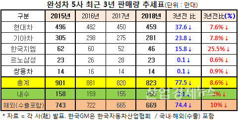 지난해 실적은 3년 전(2015년) 총 판매대수와 비교할 때 77.5만대가 줄어든 부진한 성적표로 마무리 됐다.