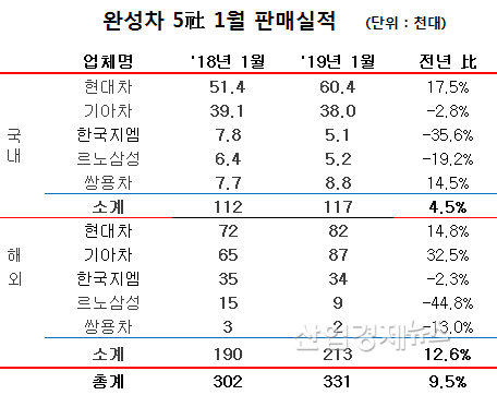 지난달 완성차 5社의 국내외 총판매량은 33.1만대로 전년 동월 보다 9.5% 성장, 웃으며 2월을 맞았다.