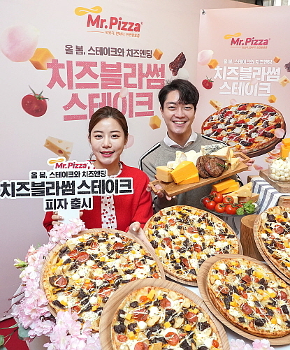 MP그룹이 운영하는 미스터피자에서는 봄 신메뉴로 와인 숙성한 호주 청정우 스테이크와 6가지 고급 치즈를 토핑한 프리미엄 피자 '치즈블라썸스테이크'를 출시했다.