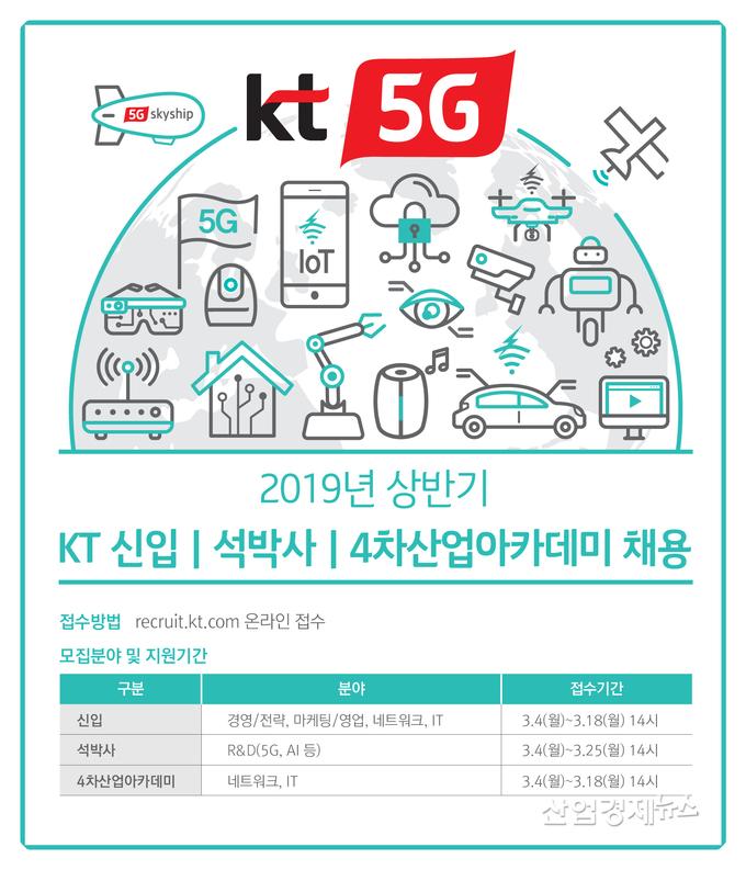 올해 KT는 5G, 플랫폼 등 융합기술 R&D 분야 채용을 확대하고, 인턴십과 연계된 ‘4차산업아카데미’를 통해 미래성장사업을 선도할 전문 인력을 확보한다는 방침이다. 특히 5G, 플랫폼, AI, 실감형미디어, 스마트에너지 등 KT의 핵심사업 분야에서 활약할 인재를 발굴할 예정이다.
