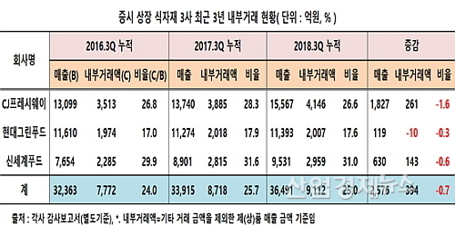 2018.3Q 내부거래 비중, 신세계 31.0%, CJ 26.6%, 현대 17.6%...각사, 전년대비 감소