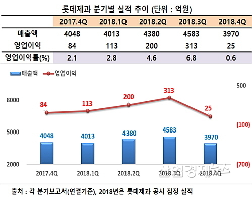 이 회사의 지난 분기보고서와 최근 공시한 2018년 잠정영업실적(연결기준)에 따르면 롯데제과의 지난해 4분기 매출과 영업이익은 3970억 원과 25억 원으로, 2017년 4분기 4048억과 84억과 비교해 매출은 1.9% 줄고 영업이익은 무려 70.4%나 급감해 주위를 어리둥절하게 만들었다.