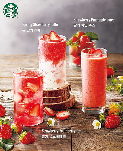 딸기의 새콤함과 아가베 시럽의 달콤함이 우유와 어우러진 ‘봄 딸기 라떼’와 스타벅스 시그니처 티인 유스베리가 신선한 딸기와 만나 고급스러운 맛을 자아내는 ‘딸기 유스베리 티’, 새콤한 딸기와 달콤한 파인애플이 조화로운 ‘딸기 파인주스’ 등 3종으로 출시됐다.