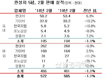 [엔트로피타임즈 김소산 기자] [엔트로피타임즈 김소산 기자] 현대자동차, 기아자동차, 한국지엠, 르노삼성자동차, 쌍용자동차로 대표되는 국내 완성차 5사의 판매부진이 1월에 이어 2월에도 지속되고 있다.