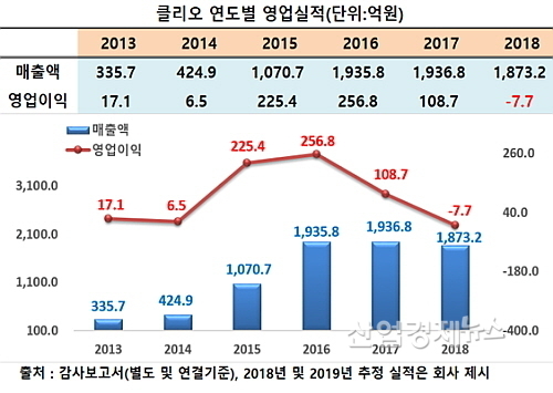최근 공시한 잠정 영업실적에 따르면 클리오의 지난해 연결기준 매출은 1873.2억 원으로 전년도 1936.8억 대비 약 63.6억이 줄어 3.3% 줄었다. 매출 감소는 창사 이래 처음이다.