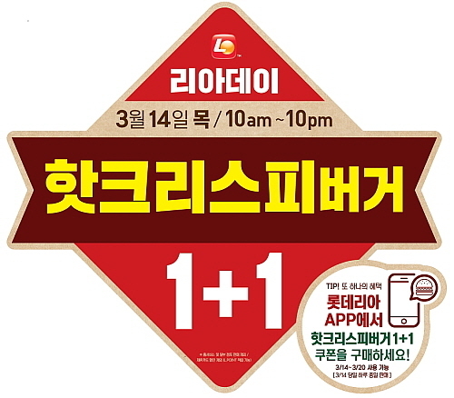 롯데리아는 3월 리아데이 행사로 ‘핫크리스피버거 1+1’ 이벤트를 14일 진행한다.