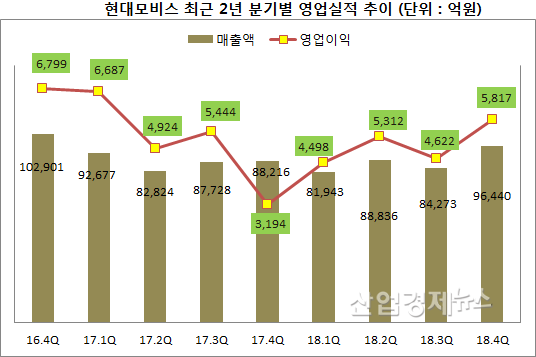 현대모비스는 홈페이지를 통해 2018년도 경영실적을 공개했다. 총매출액 35조1492억원, 영업이익 2조250억원을 기록해서 매출도, 영업이익도 전년대비 '0' 성장에 그친 실적을 보여줬다.