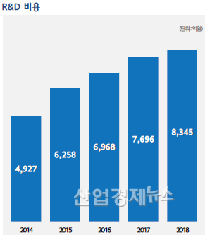 R&D비용은 2014년 4927억원부터 지속적으로 증가하고 있다. 지난해에는 4년 전의 두 배에 가까운 8345억 원까지 확대됐다.