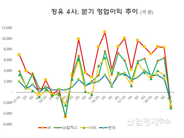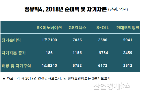 SK이노베이션은 2018년 1조7100억원의 당기순이익을 실현했고, GS칼텍스는 7036억원, S-OIL은 2580억원, 현대오일뱅크는 28일 현재 감사보고서를 제출하지 않아 연간 당기순이익을 알 수 없지만 3분기 까지 5941억원의 당기순이익을 실현했다.