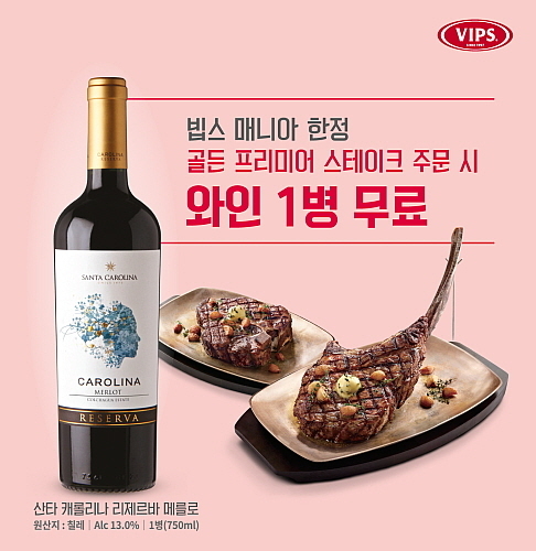 지난 2월에 출시한 ‘골든 프리미어 스테이크’인 ‘토마호크’ 또는 ‘포터하우스’를 ‘빕스 매니아’가 주문하면, 스테이크와 최상의 페어링을 이루는 ‘산타 캐롤리나 리제르바 메를로’ 레드 와인 1병(750ml)을 3월 내내 공짜로 제공하는 내용이다.
