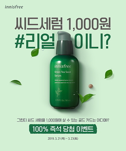 아모레퍼시픽그룹 자연주의 화장품 브랜드 이니스프리는 3월 21일부터 23일까지 3일간 그린티 씨드 세럼을 1천원에 구매할 수 있는 ‘씨드세럼 1,000원 #리얼이니’ 이벤트를 진행한다.