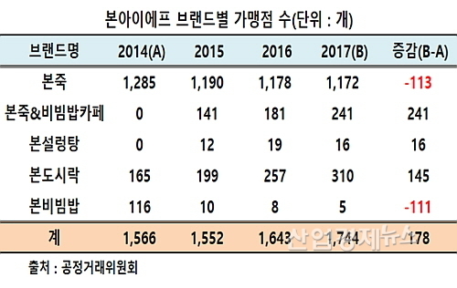 반면에 같은 기간 ‘본죽&비빔밥카페’ 241개, 본설렁탕 16개, 본도시락 145개 등 총 402개가 순증해 본죽과 본비빔밥에서 감소한 가맹점 224개를 메우고도 178개나 더 늘었다.