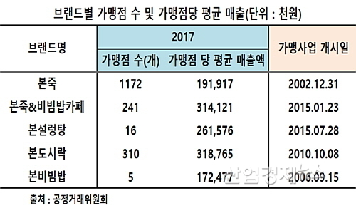 공정거래위원회 가맹사업현황에 따르면 지난 2017년 기준 본죽, 본죽&비빔밥카페, 본설렁탕, 본도시락, 본비빔밥 등 5개 브랜드 가운데 가맹점당 평균 매출이 가장 많은 곳은 본도시락으로 가맹점 1곳당 평균 3.18억의 연매출을 올린 것으로 나타났다.