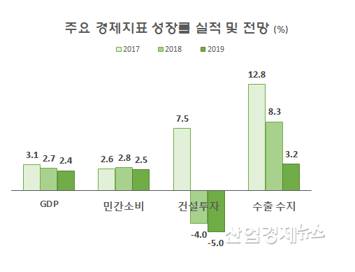 수출의 경우 글로벌 경기하락으로 우리의 수출상대국인 중국과 미국의 성장률이 감소하고, 미·중 무역갈등이 장기화되고 있으며, 반도체 가격마저 하락하는 등 삼중고를 겪을 것으로 예상돼 증가율이 큰 폭으로 줄어 들 것이라는 분석이다.