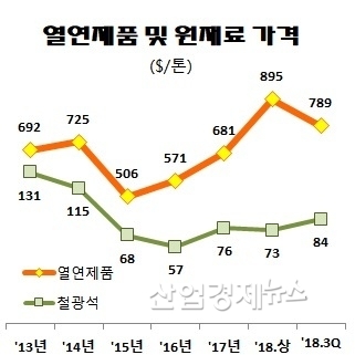 하지만 2017년 중국 철강업계가 구조조정을 통해 생산물량을 줄이면서 철강가격이 오르기 시작했다. 톤당 681 달러로 600 달러를 넘어서더니 2018년 들어서는 895달러까지 치솟았다. 최저점이었던 2015년 보다 무려77%나 오른 가격이다.