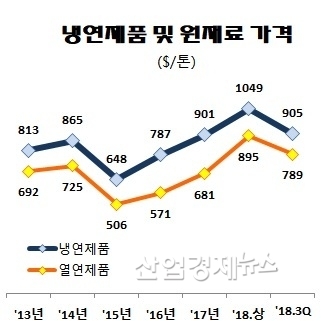 냉연제품과 열연제품의 가격차이를 살펴보면 2016년 냉연제품이 열연제품보다 216달러 더 높았고, 2017년에는 220달러로 차이가 다소 커졌다. 하지만 2018년에 들어오면서 상반기에 154달러로 폭을 줄이더니 3분기에는 116달러로 2년만에 가격차이가 반토막이 났다.