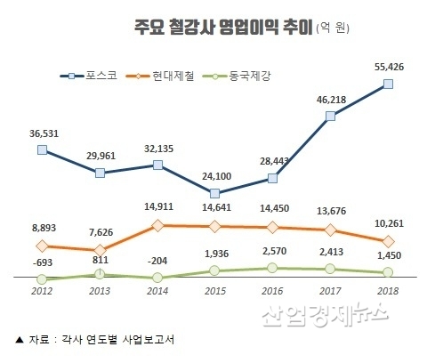 ■ 포스코 2년 사이 이익 95% 증가 하는 동안 현대제철 30%↓, 동국제강 44%↓
