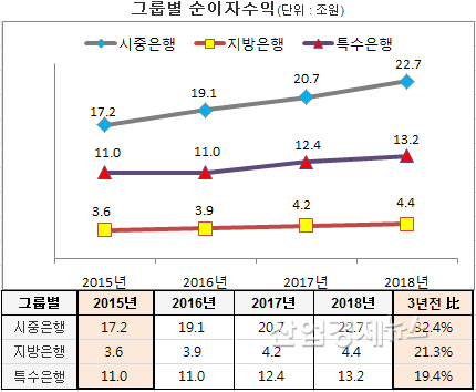 특수은행은 이자수익을 2015년 11조원 → 2018년 13.2조원으로 2.2조원, 지방은행도 같은 기간 3.6조원 → 4.4조원으로 8천억 원을 늘려갔다.