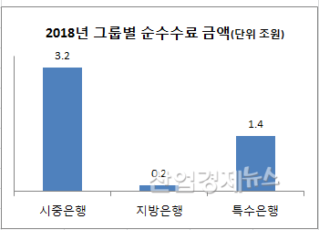 한편, 지난해 국내은행들이 거둬들인 순수수료(수수료수입-수수료비용) 금액은 4.8조원이었다. 이를 그룹별로 보면, 시중은행이 3.2조원으로 압도적으로 많았고, 이어서 특수은행 1.4조원, 지방은행 2천억 원 순이었다.