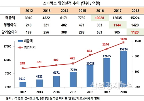 이마트 연결감사보고서에 따르면 스타벅스는 지난해 1조5224억 원의 매출을 올려 직전년도의 1조2635억 원 대비 25.8% 급증, 창사 최대 매출 기록을 갈아치우는 양호한 실적을 기록했다.
