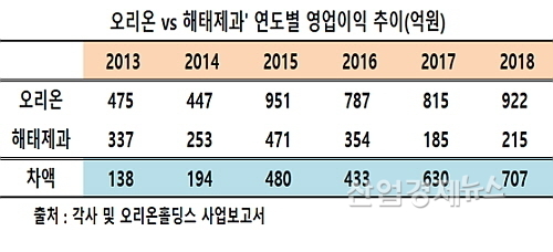 지난해 양사의 별도기준 영업이익을 살펴보면 오리온이 2017년 815억 원 대비 13.1% 증가한 922억을 시현한 반면에 해태제과는 전년도 185억 대비 15.8% 늘어난 215억을 기록 오리온에 비해 707억 원이나 밑돌아 큰 폭의 격차를 보였다.