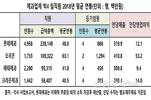 롯데제과, 오리온, 해태제과, 크라운제과 등 외형기준 빅4의 지난해 사업보고서에 따르면, 직원 1인당 평균 연봉과 등기임원 보수 모두 오리온, 롯데, 해태, 크라운 순으로 많았다.