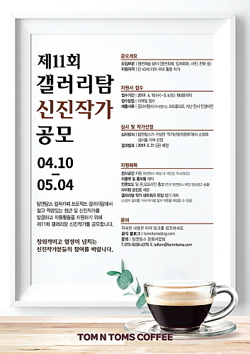 [엔트로피타임즈 민혜정 기자] 커피전문점 탐앤탐스가 5월 4일 오후 6시까지 ‘제11회 갤러리탐 신진작가 공모’를 진행한다고 16일 밝혔다.
